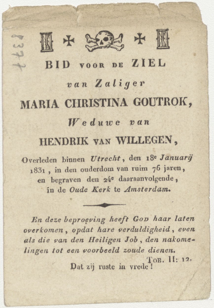 H. Thomas (Frans), kz. Bid voor ziel Goutrok-van Willegen (+1831) Utrecht