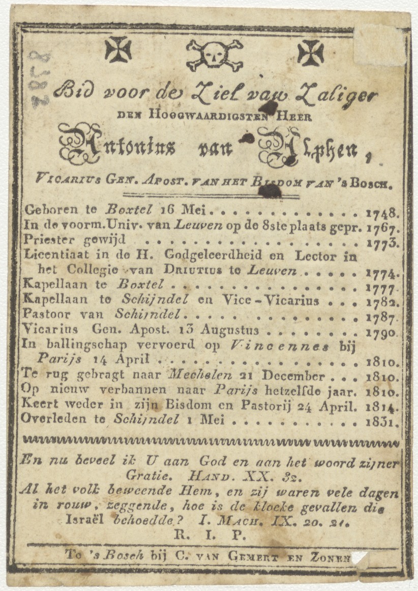 Maria met Christuskind, huiselijke scène, kz. Religieus; bid voor ziel Antonius van Alphen (+1831) vicarius gen. apost. bisdom Den Bosch