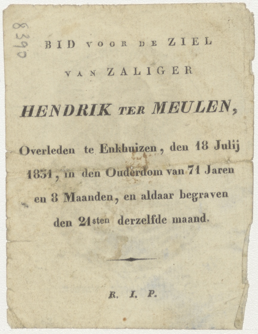 H. Elisabeth, kz. Bid voor ziel Ter Meulen (+1831) Enkhuizen