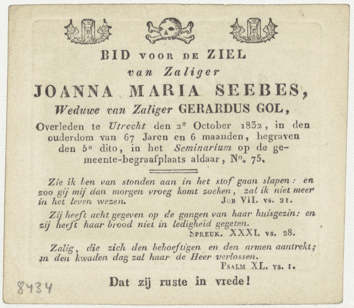 Begraving van Sara (Gen. 23:19), kz. Bid voor ziel Gol-Seebes (+1832) Utrecht