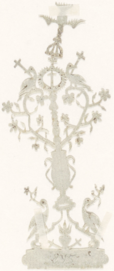 Knipsel met ooievaars, kruis en duif, kz. men lijdt of sterft (Frans)