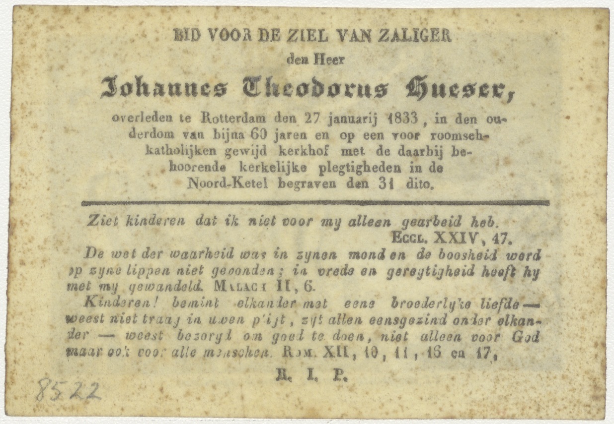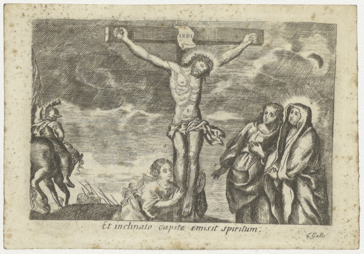 Gekruisigde Christus met Maria, Maria Magdalena en Johannes, kz. Bid voor ziel Hueser (+1833) Rotterdam