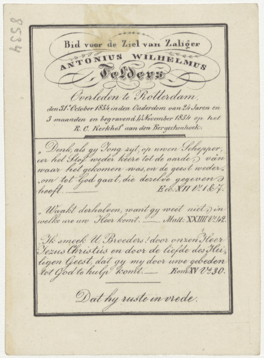 Gebroken zuil met zandloper, de tijd vliegt voorbij, kz. Bid voor ziel Telders (+1834) Rotterdam
