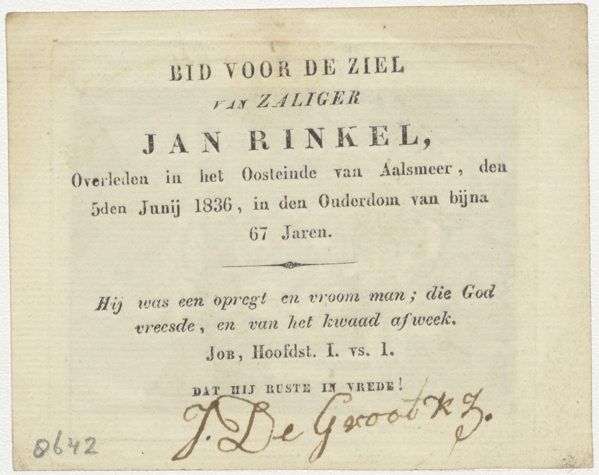 Jezus in 't midden der leeraren (Luc. 2:46), kz. Bid voor ziel Rinkel (+1836) Oosteinde van Aalsmeer