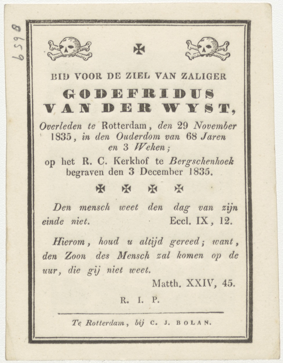 Waakt de boosheid loert, kz. Bid voor ziel Van der Wijst (+1835) Rotterdam