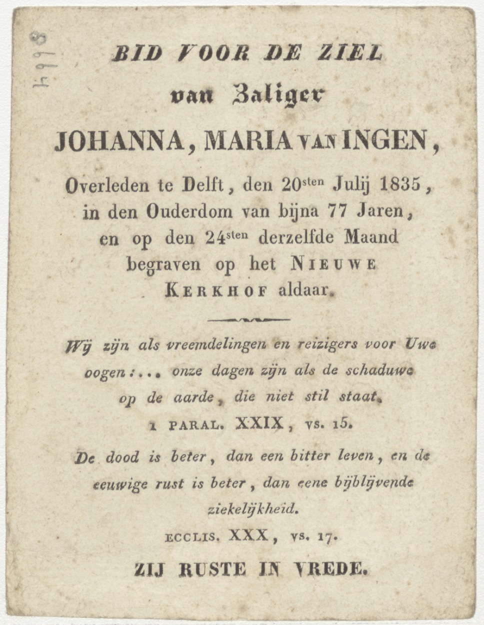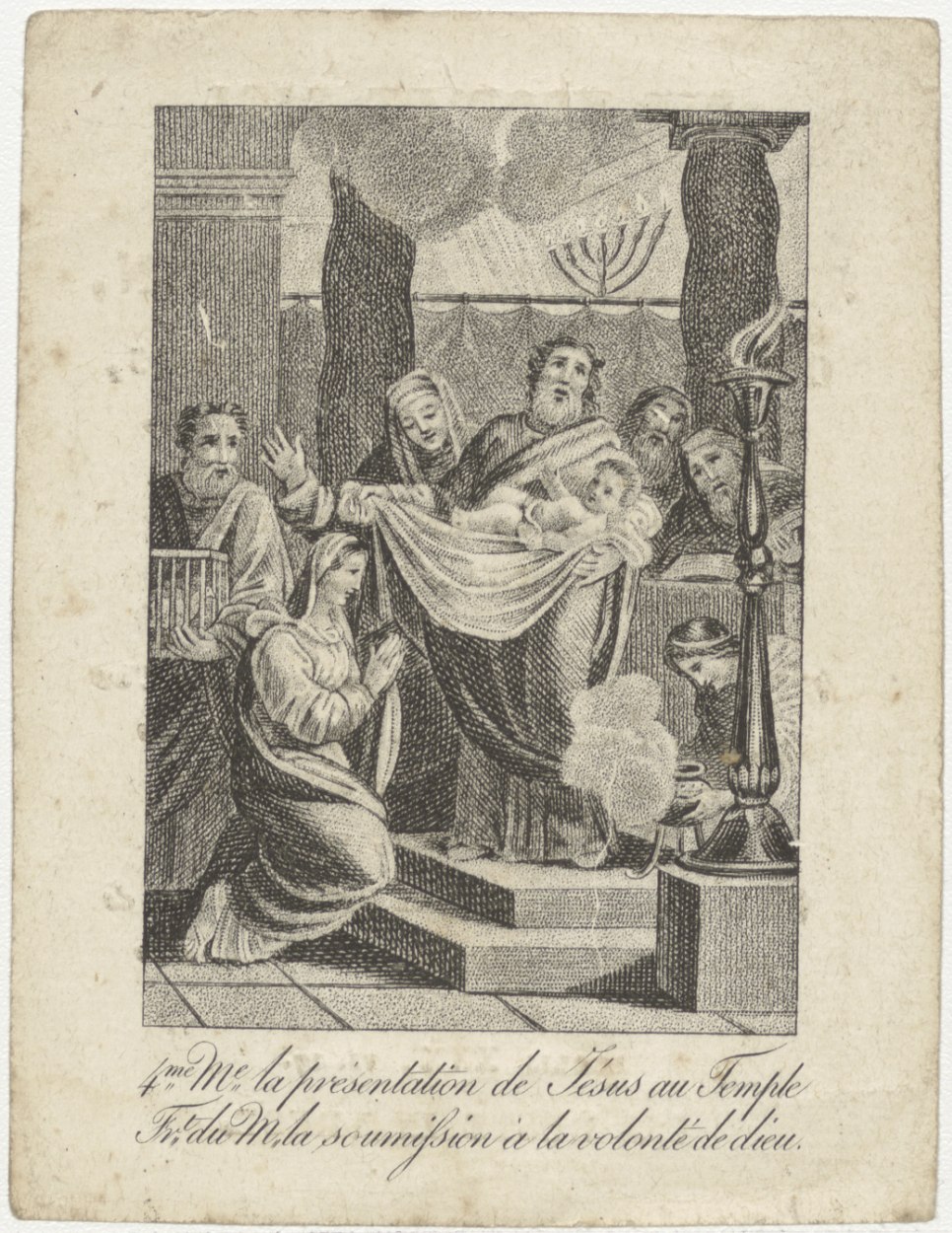 Presentatie van Christus in de tempel (Frans), kz. Bid voor ziel Van Ingen (+1835) Delft
