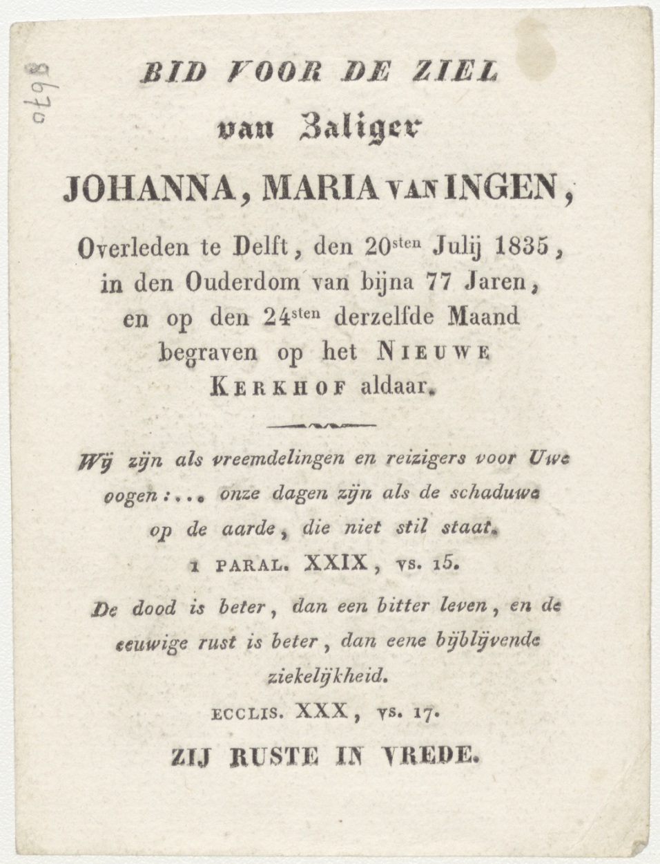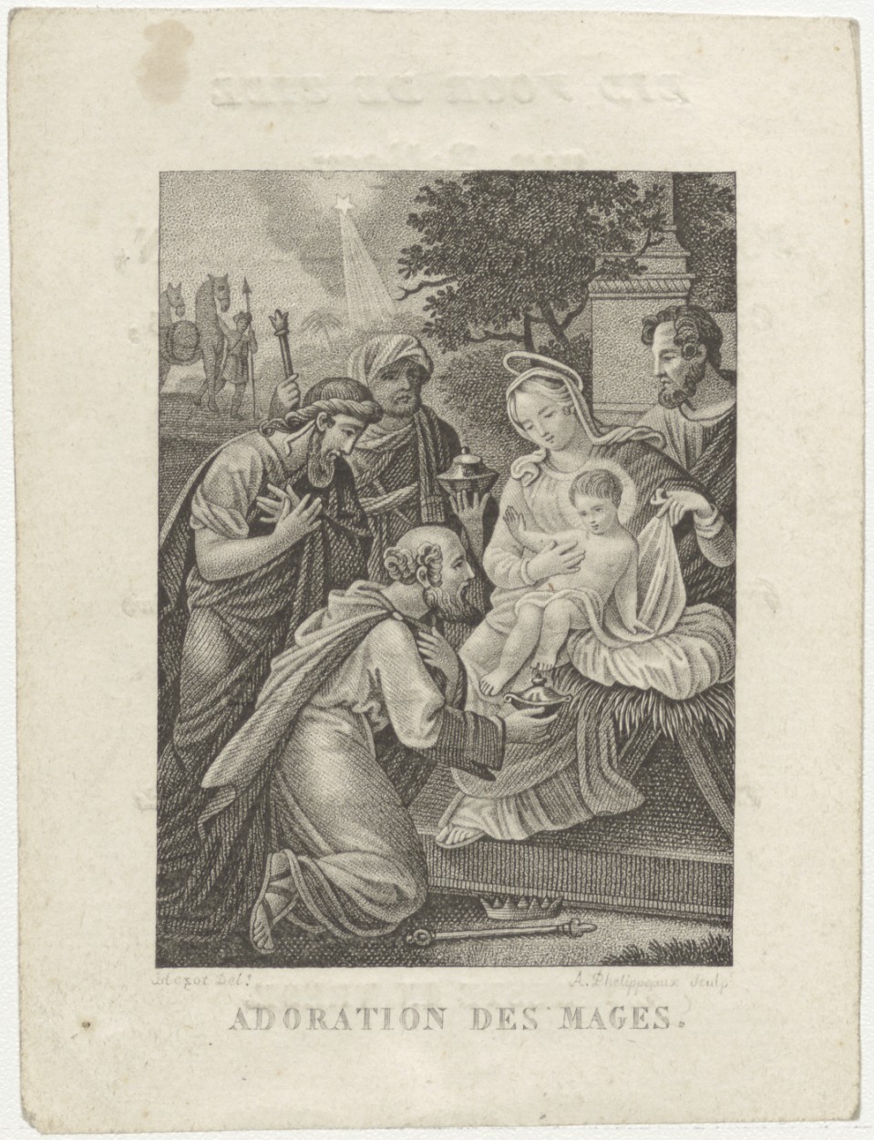 Aanbidding der koningen (Frans), kz. Bid voor ziel Van Ingen (+1835) Delft