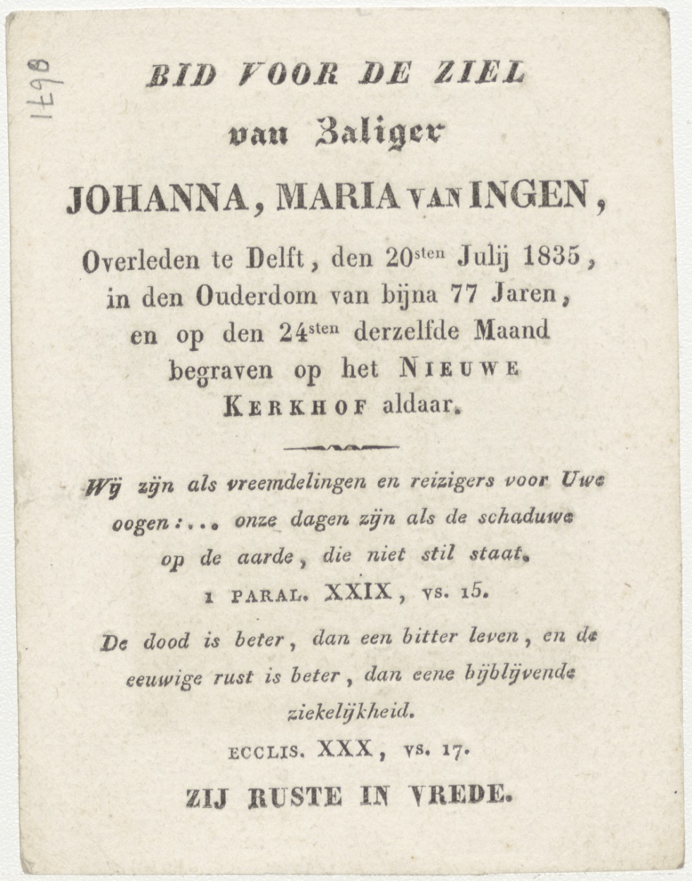 H. Laurent (Frans), kz. Bid voor ziel Van Ingen (+1835) Delft