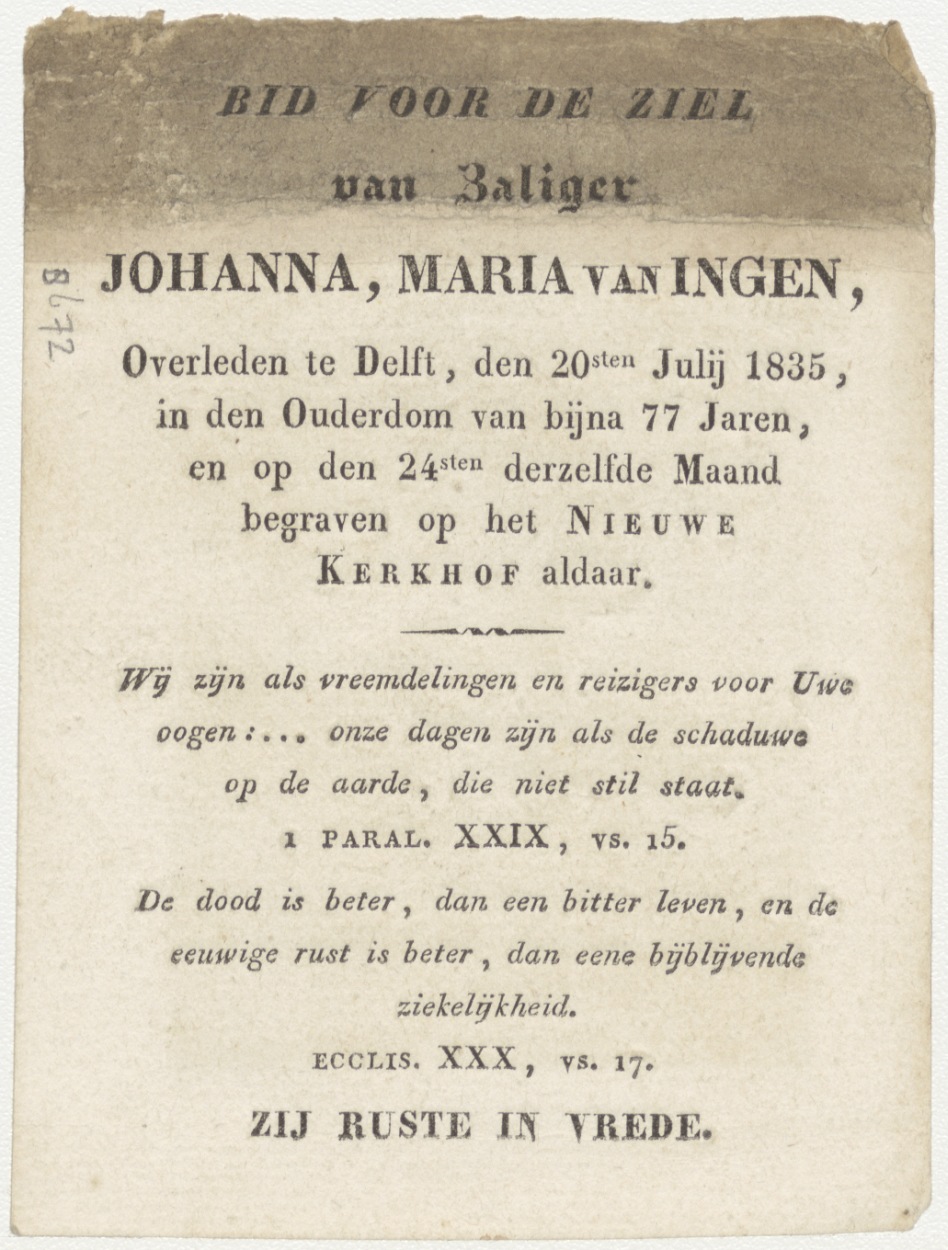 H. Christine (Frans), kz. Bid voor ziel Van Ingen (+1835) Delft
