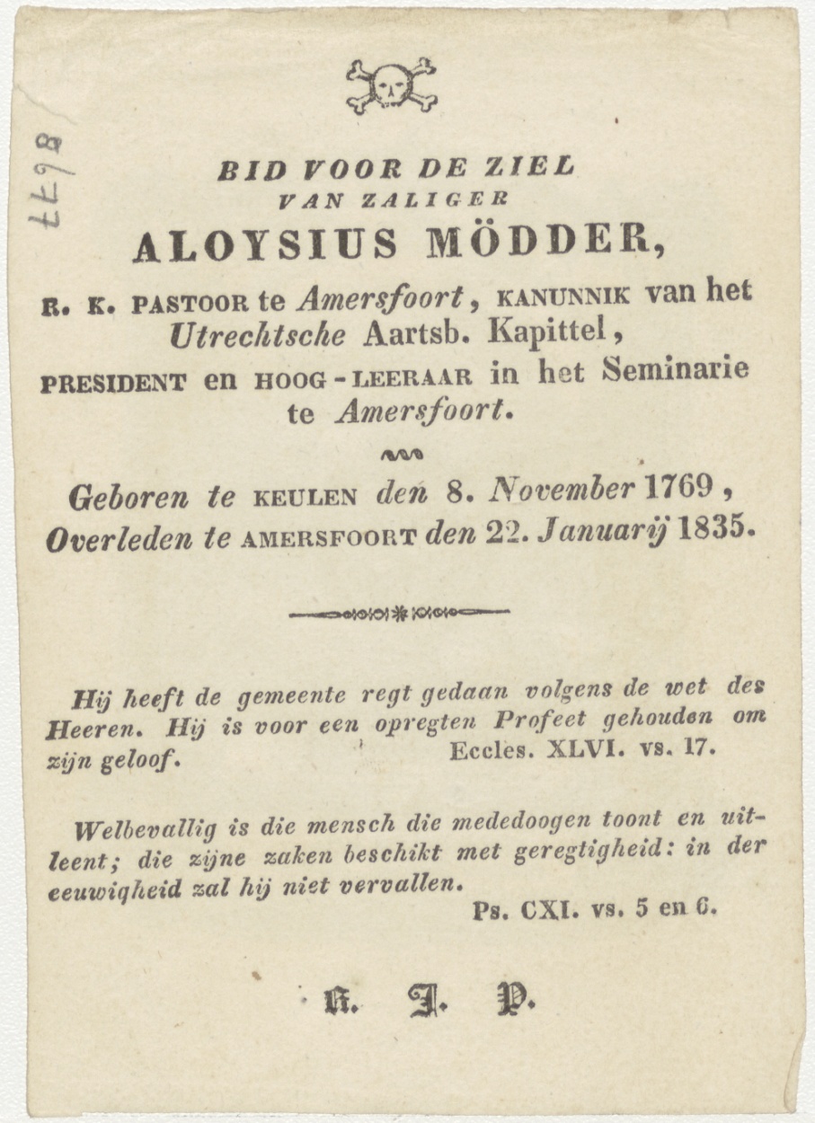 Uw hart zij een tempel des H. Geest, kz. Religieus; bid voor ziel Aloysius Mödder (+1835) pastoor te Amersfoort, kanunnik Utrecht