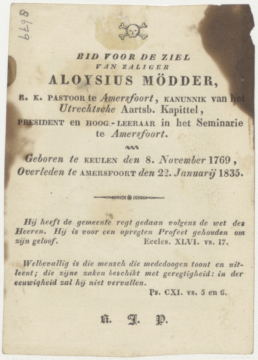 Schedel, gedenkt te sterven, kz. Religieus; bid voor ziel Aloysius Mödder (+1835) pastoor te Amersfoort, kanunnik Utrecht
