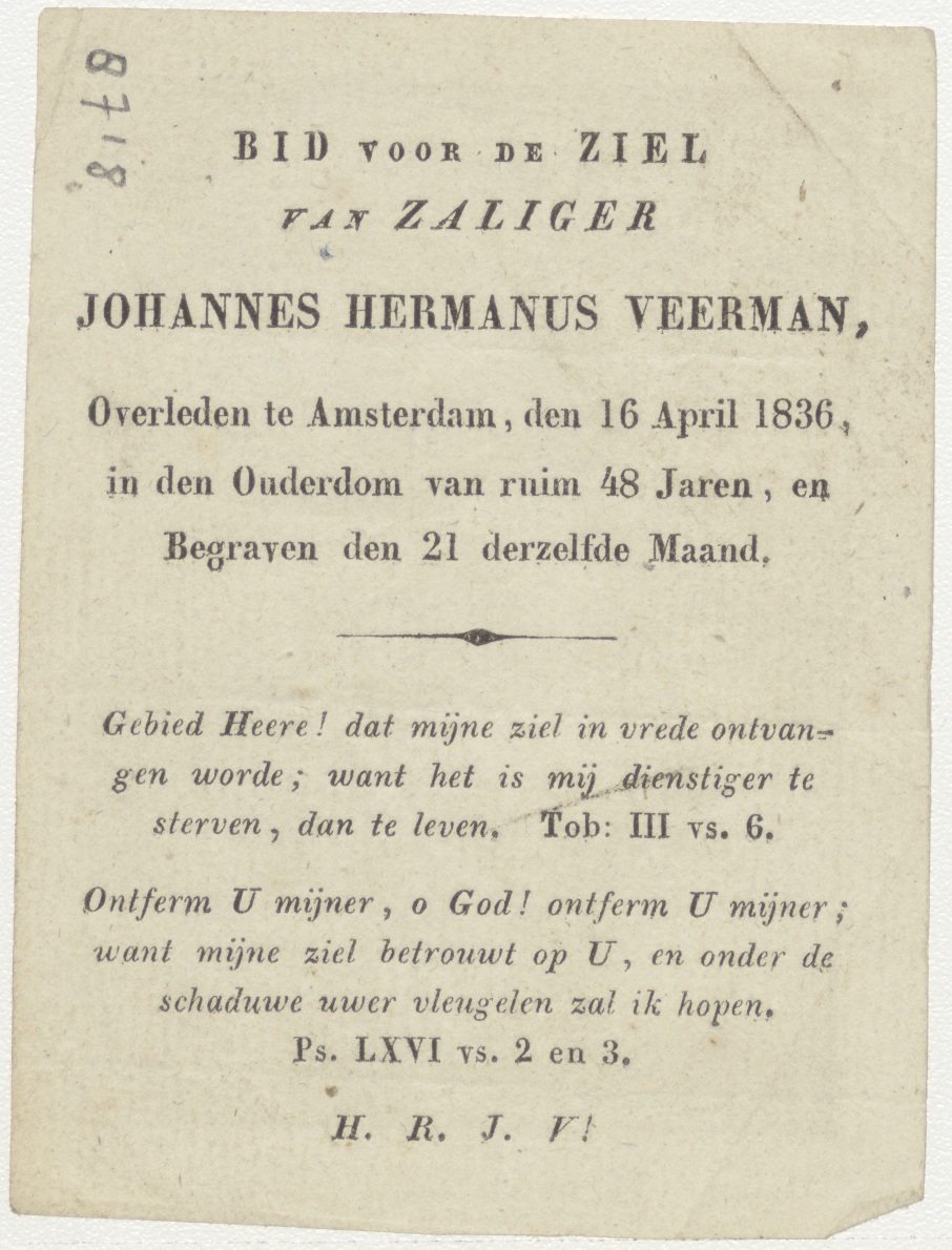 H. Mattheus, kz. Bid voor ziel Veerman (+1836) Amsterdam