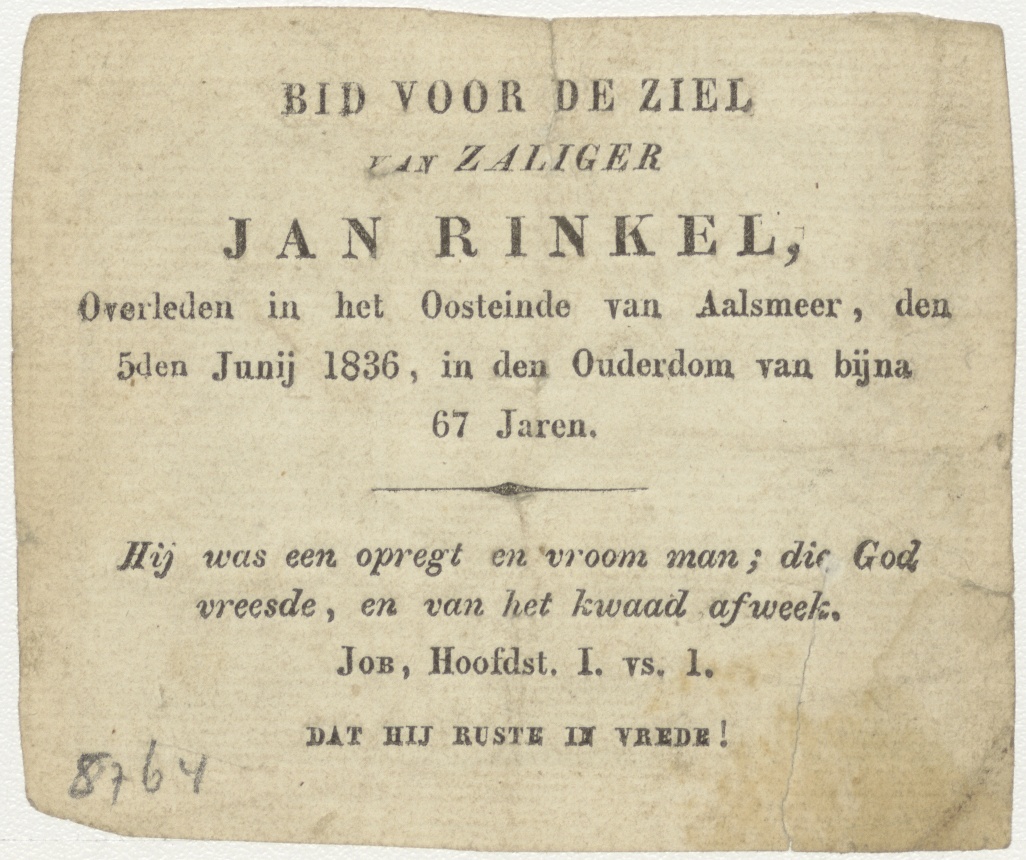 't Hooft van Johannes (1 Mac. 6:27-28), kz. Bid voor ziel Rinkel (+1836) Oosteinde van Aalsmeer