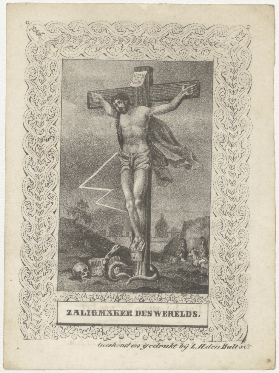 Gekruisigde Christus, zaligmaker des werelds, kz. Bid voor ziel Heyligers (+1836) Schiedam