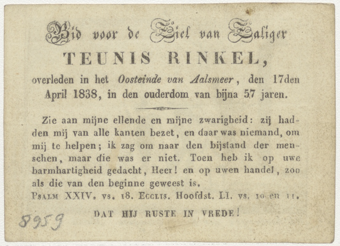 Herbergen der vreemdelingen (Math.25:36), kz. Bid voor ziel Rinkel (+1838) Oosteinde van Aalsmeer