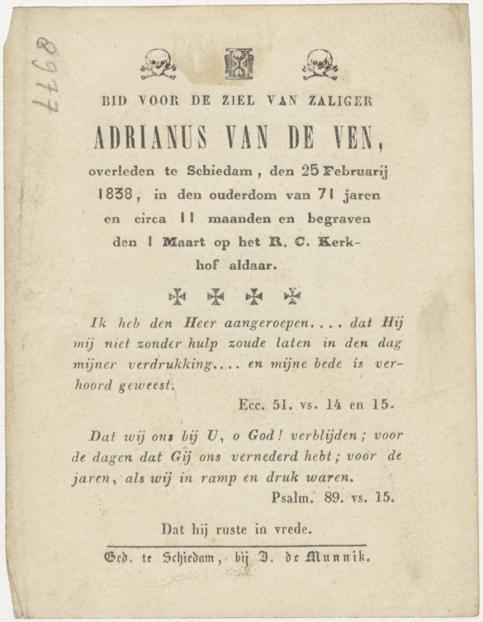 Voor hem zijn wij allen gelijk, kz. Bid voor ziel Van de Ven (+1838) Schiedam