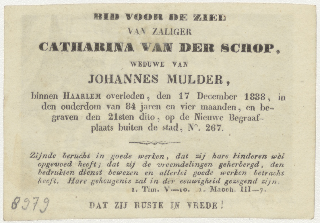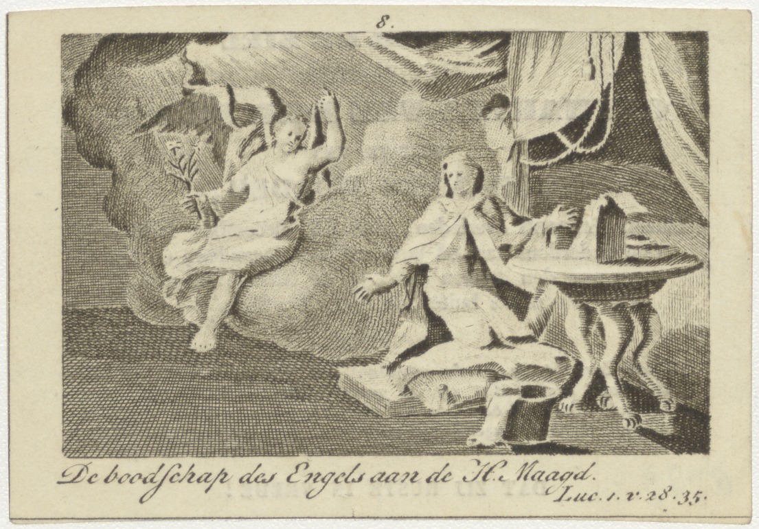 Annunciatie (Luc. 1:28-35), kz. Bid voor ziel Van der Schop-Mulder (+1838) Haarlem