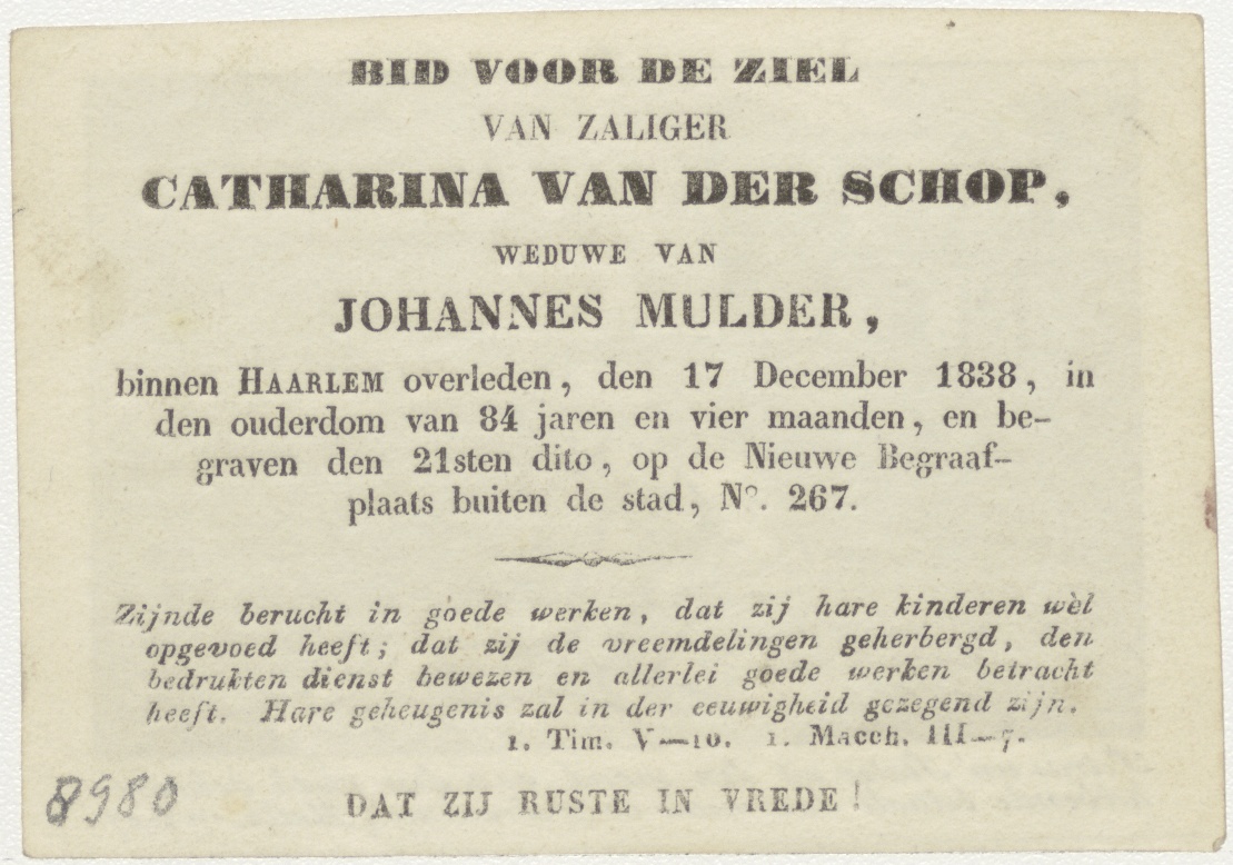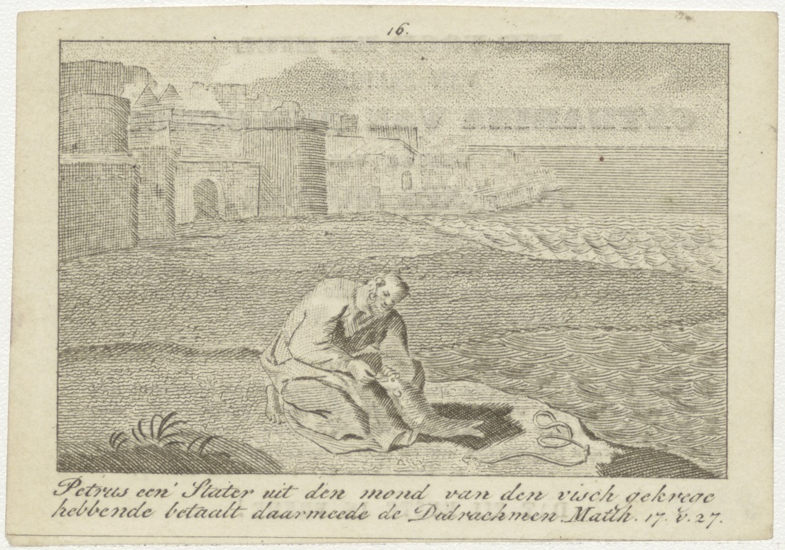 Petrus een stater uit den mond van den visch gekrege hebbende ... (Math. 17:29), kz. Bid voor ziel Van der Schop-Mulder (+1838) Haarlem
