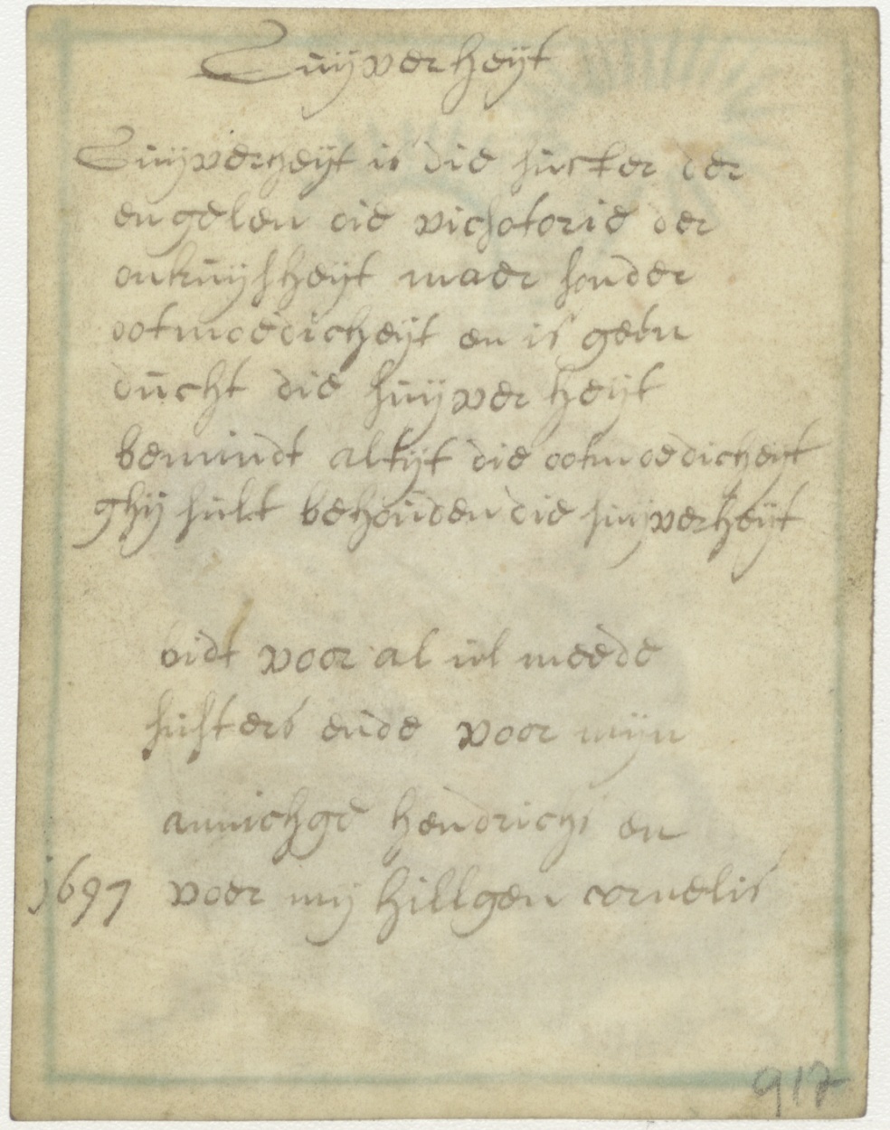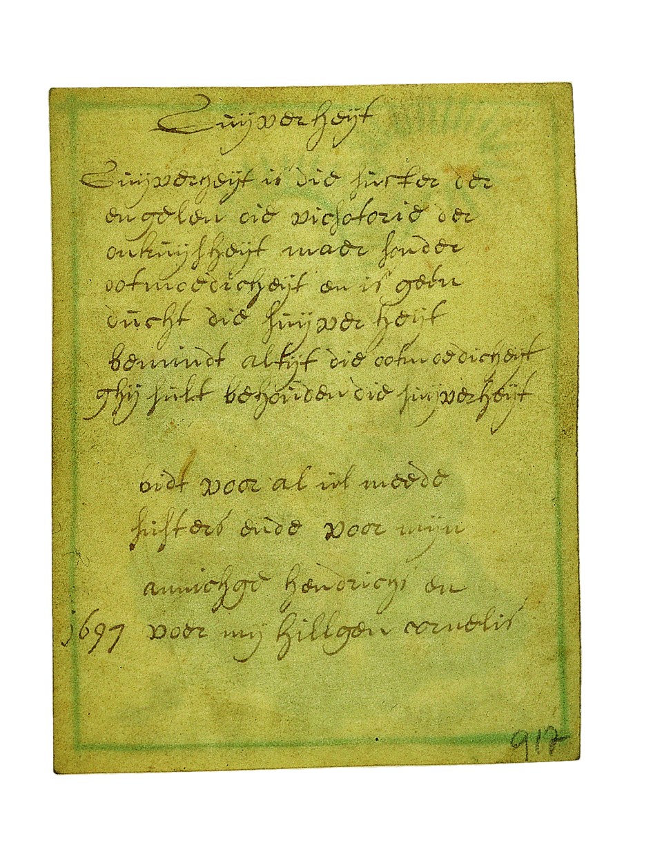 Op keerzijde de tekst: Suijverheijt Suijverheijt is die suster der engelen die victorie der onkuijsheijt maer sonder ootmoedichheijt en is geen ducht die suijverheijt bemindt altijt die ootmoedicheijt ghij sult behouden die suijverheijt 160 bidt voor al uw meede susters ende voor mijn Annichge Hendrichs en voor mij Hillgen Cornelis 1697