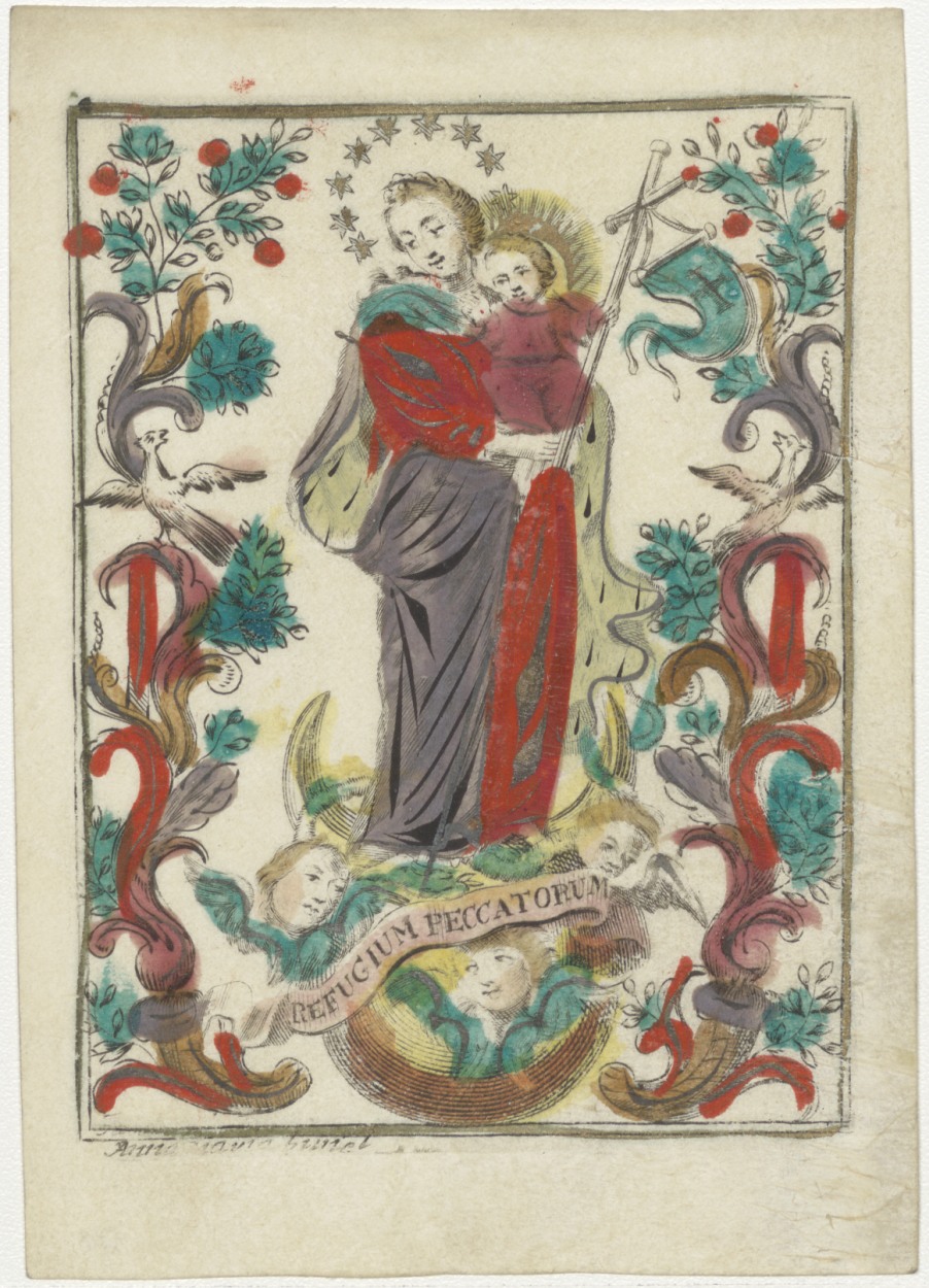Maria met Christuskind op maansikkel, refugium peccatorum, ingekleurd