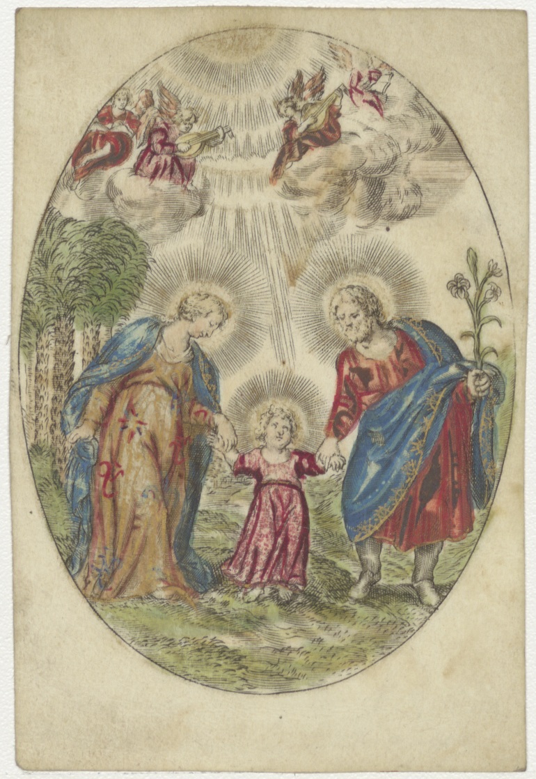 Jezus, Maria, Joseph (Jozef, Christus), ingekleurd, kz. tekst;