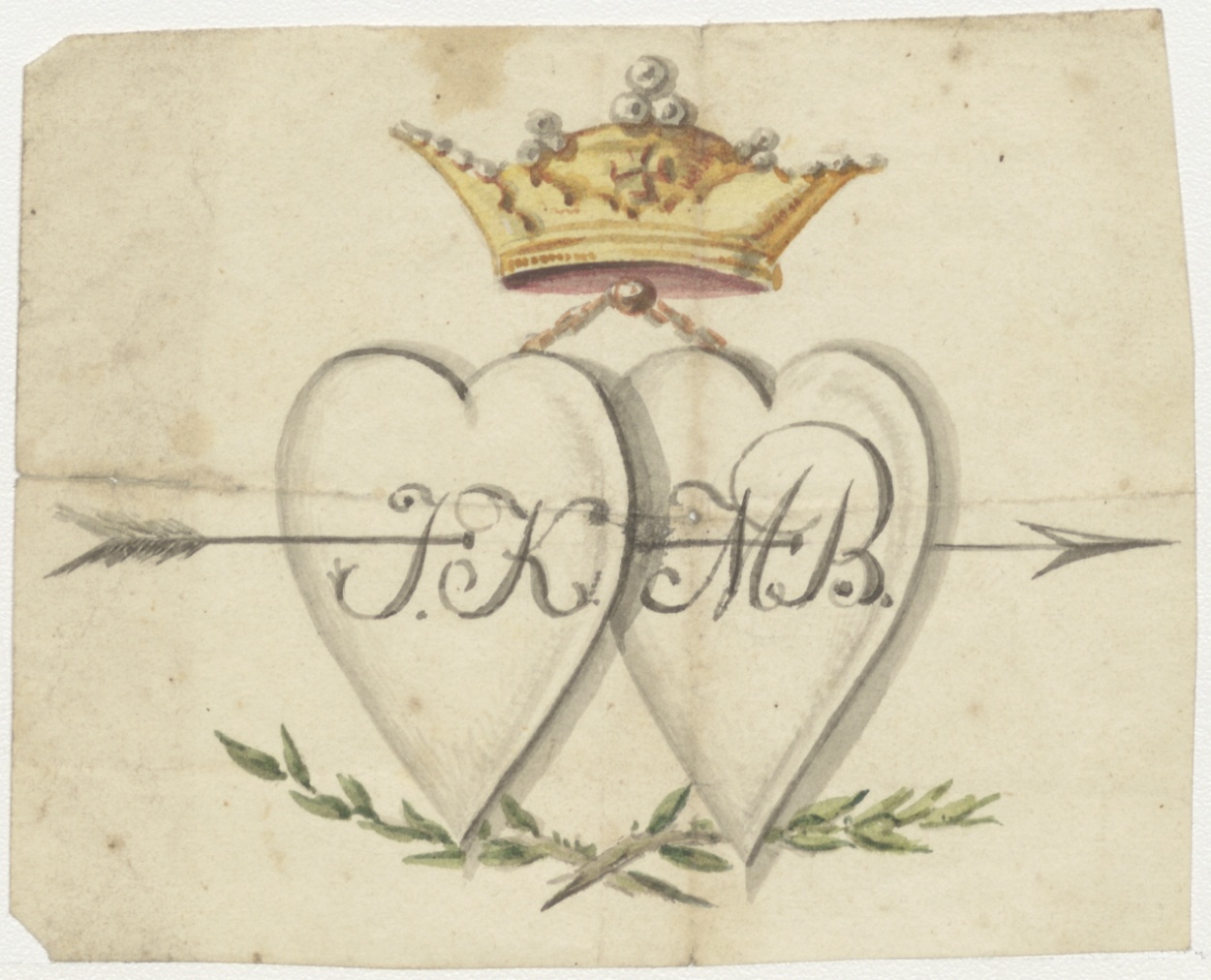 Twee door een pijl doorboorde harten met kroon erboven