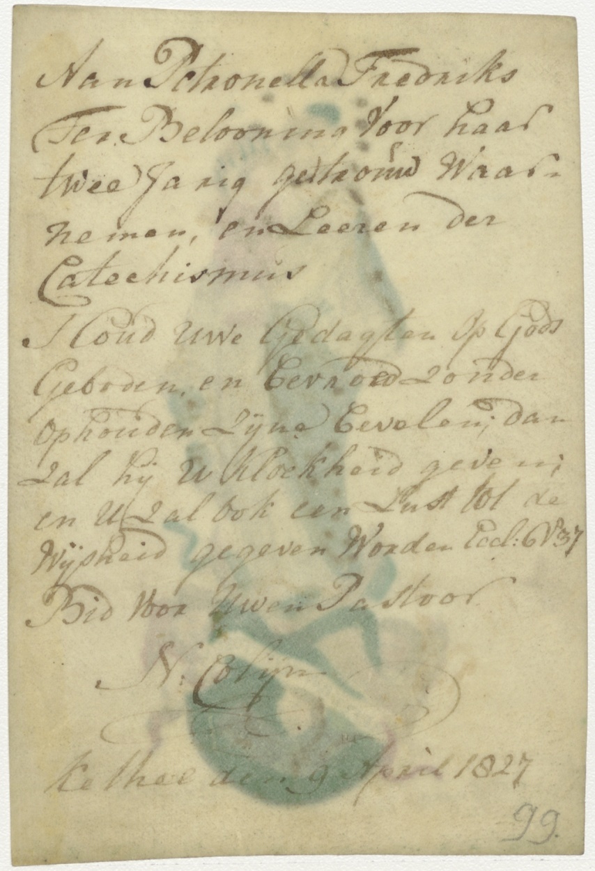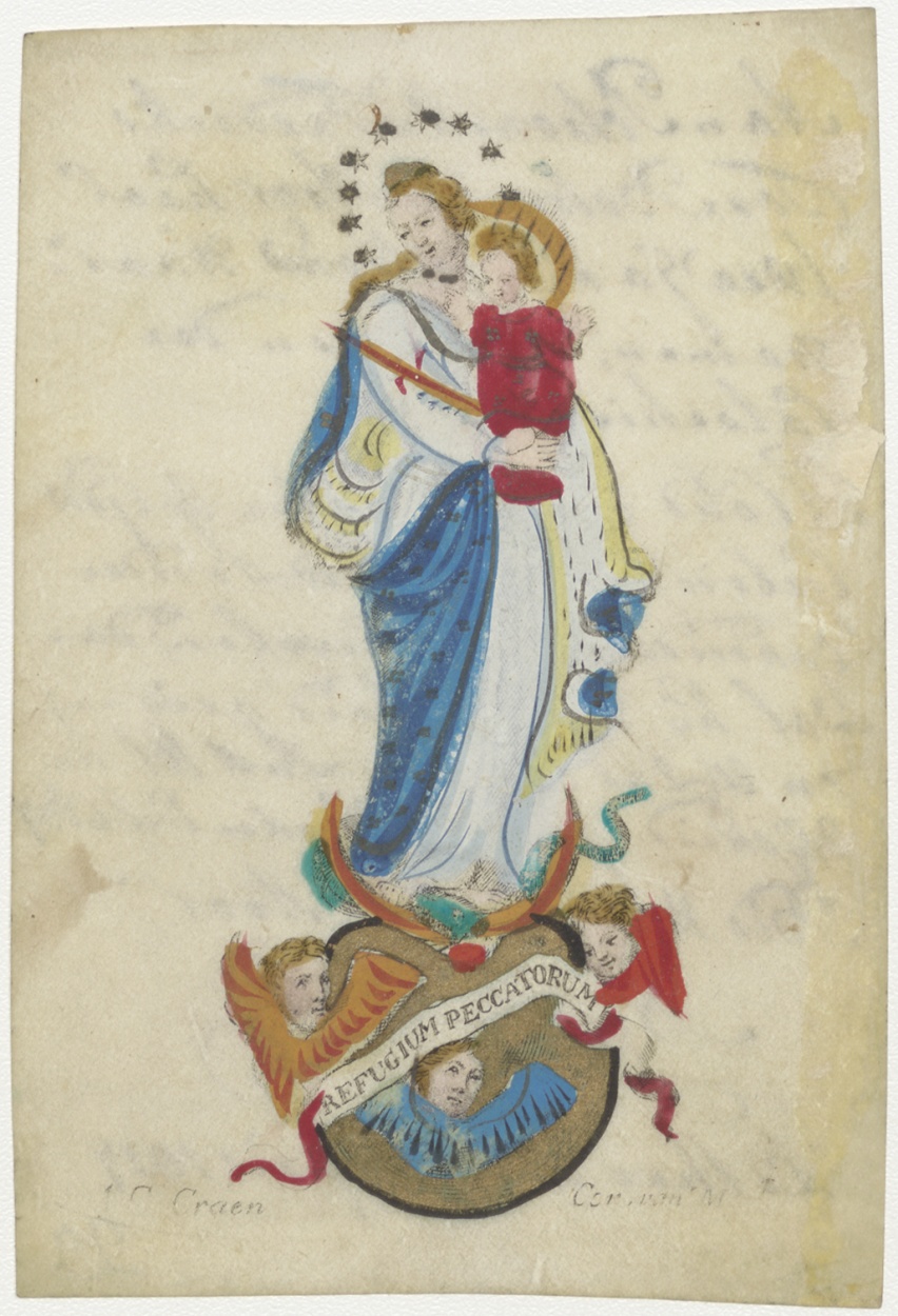 Maria met Christuskind op maansikkel, refugium peccatorum, ingekleurd, kz. beloning leren cathechismus Petronella Fredriks;pastoor N. Colijn;1827