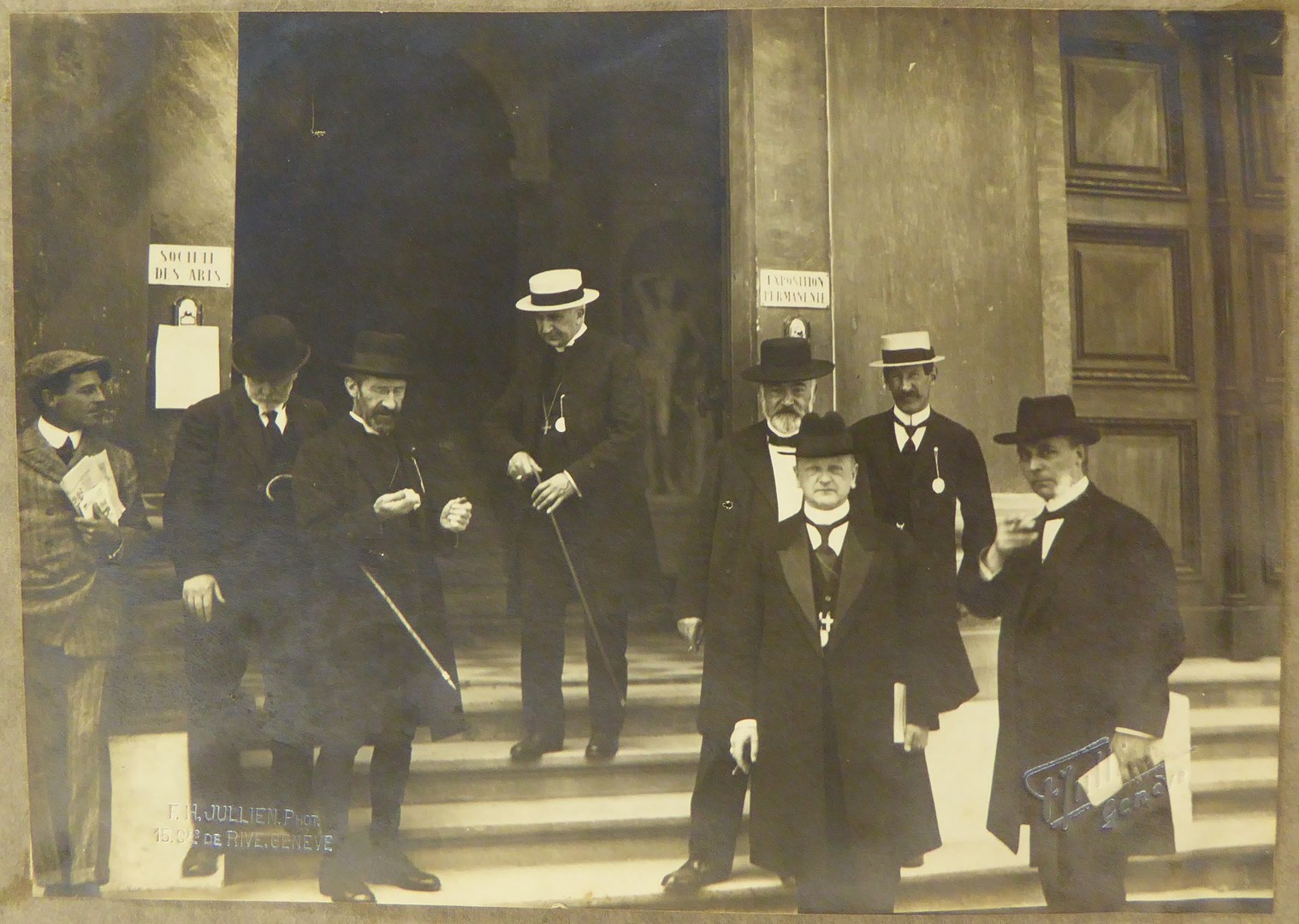 Groepsportret van acht mannen voor expositieruimte Societe des Arts