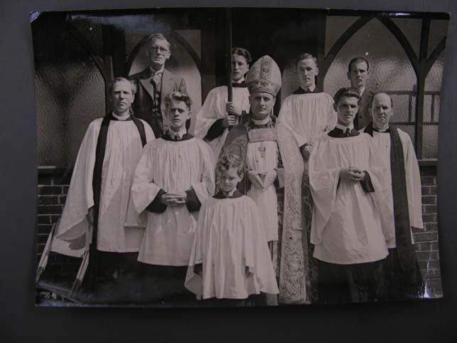 Groepsportret met tien personen met centraal een bisschop