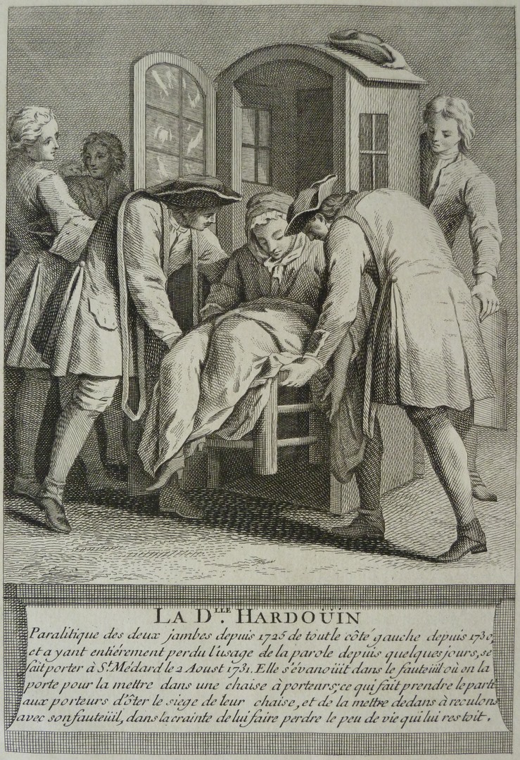 Hardouin op draagstoel om zich naar het graf van François de Paris te laten brengen