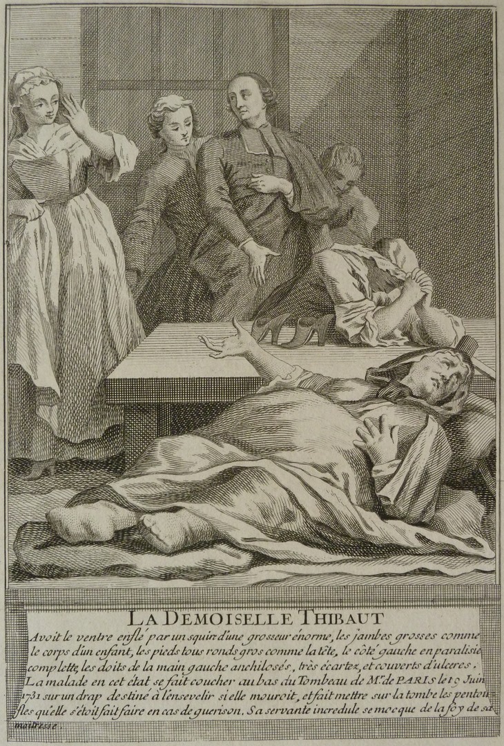 Dikke opgeblazen vrouw ligt op het graf van François de Paris