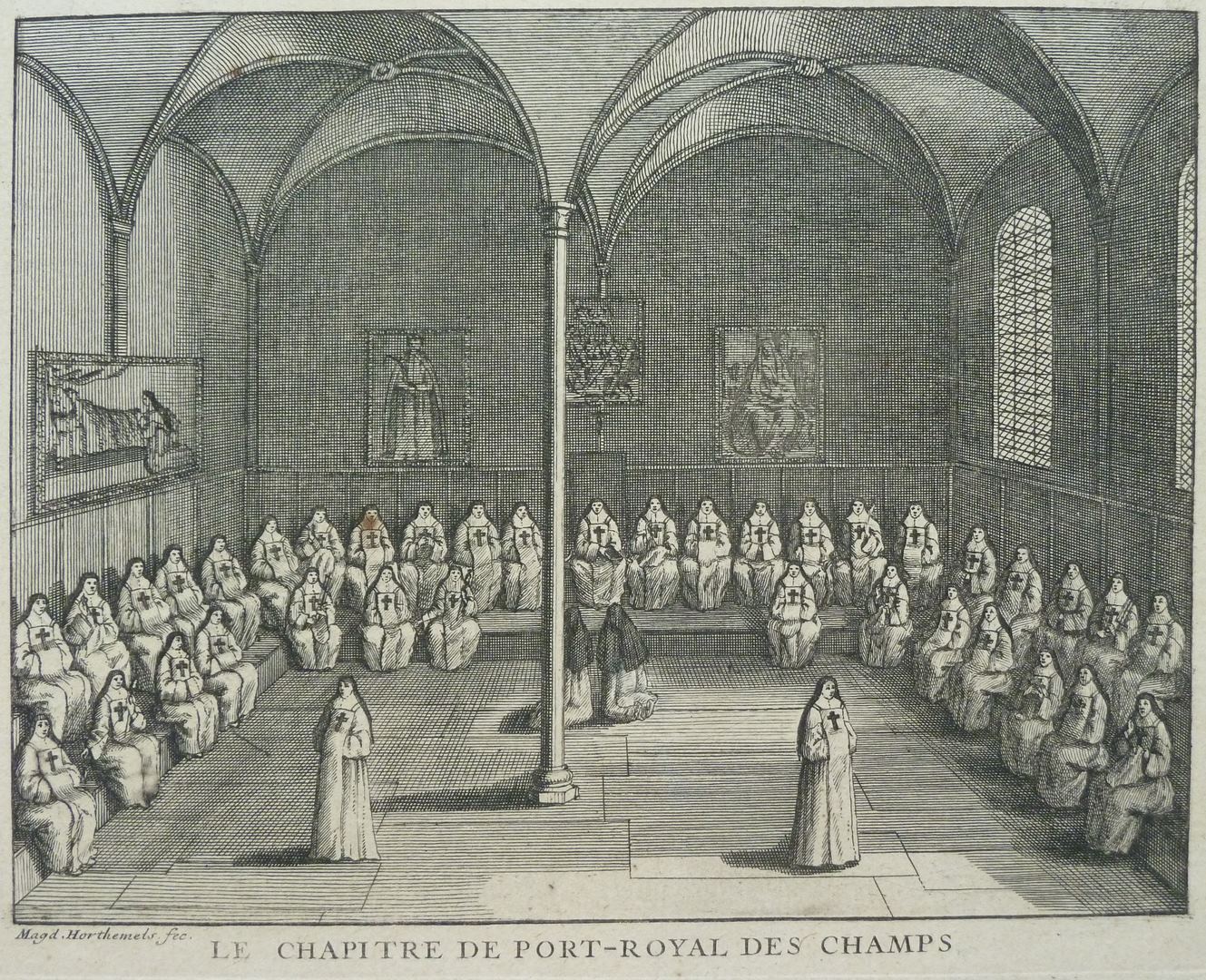 Gezichten op het klooster van Port-Royal (serie) nr. 9: Het kapittel van Port-Royal des Champs, nonnen zitten langs muren, twee geknield in het midden