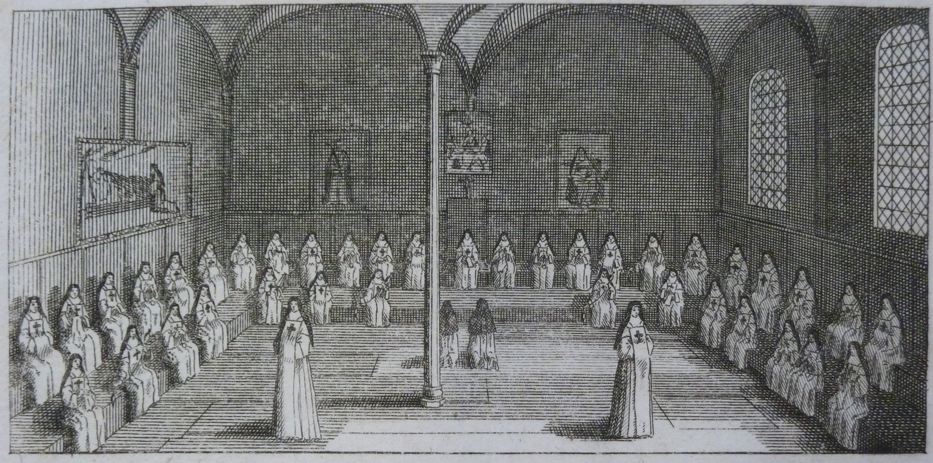 Het kapittel van Port-Royal des Champs, nonnen zitten langs muren, twee geknield in het midden