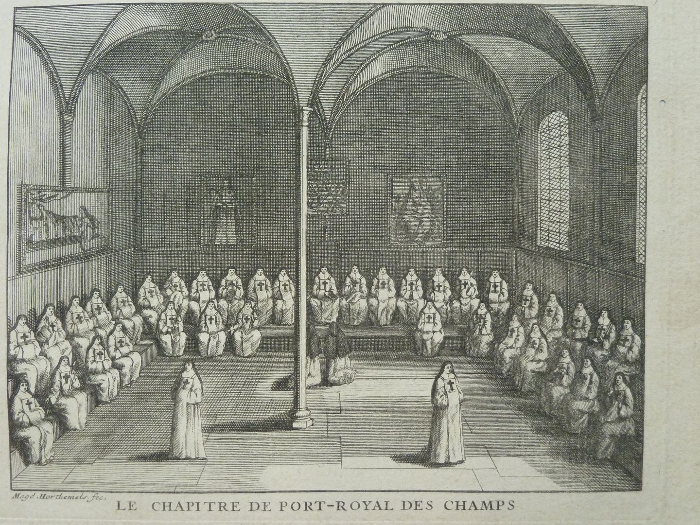 Gezichten op het klooster van Port-Royal (serie) nr. 9: Het kapittel van Port-Royal des Champs, nonnen zitten langs muren, twee geknield in het midden