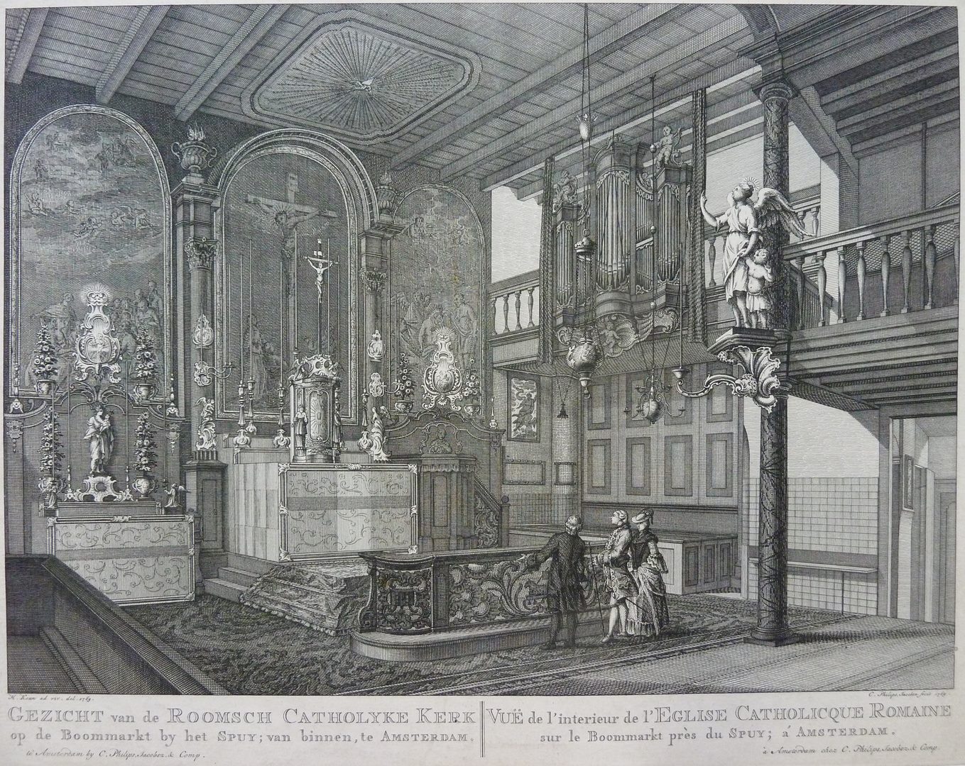 Amsterdam, "gezicht op de Roomsch Catholyke Kerk op de Boommarkt bij het Spuy"