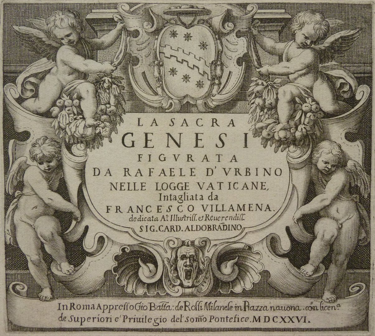 Schilderingen in de Loggia van Rafaël (serie): Titelprent met "La sacra genesi figurata da Rafaele d'Urbino nelle logge Vaticane ..." omgeven door cherubijnen en bekroond met wapen