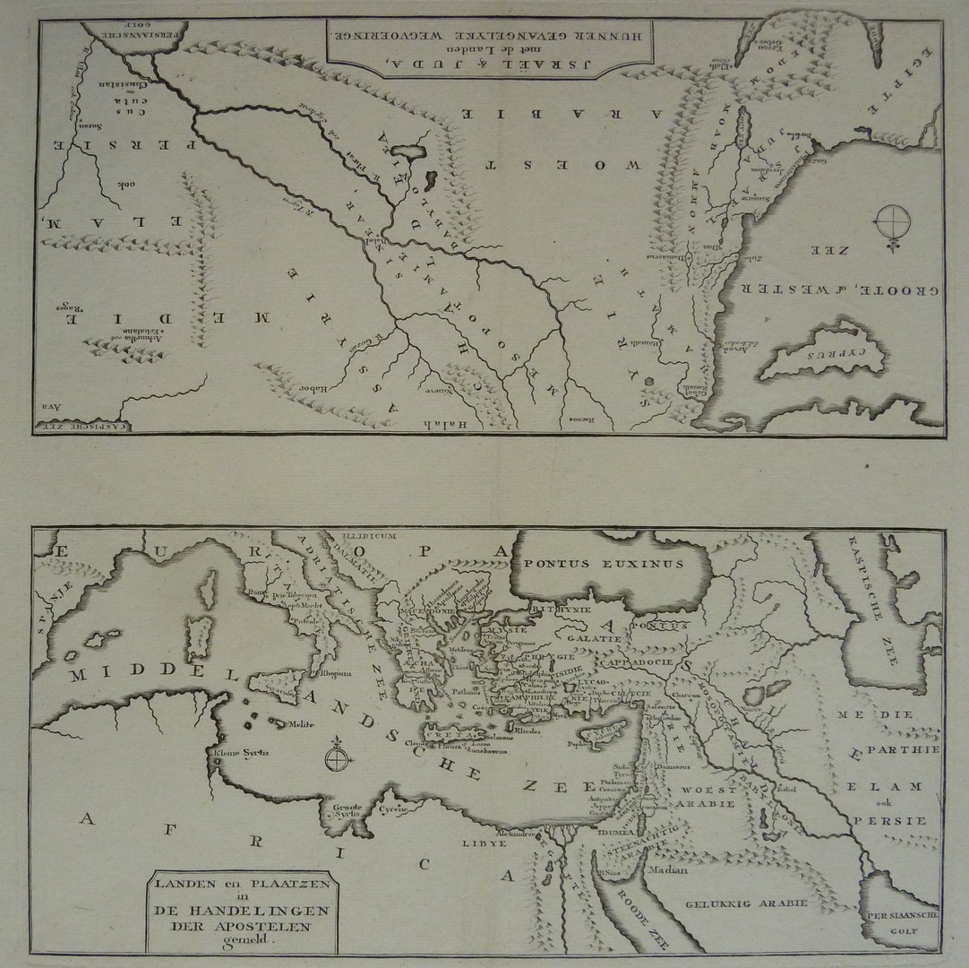 Twee bijbelse landkaarten: "Landen en plaatsen in de handelingen der apostelen gemeld." en "Israel & Juda, met de landen hunner gevangelyke wegvoeringe."