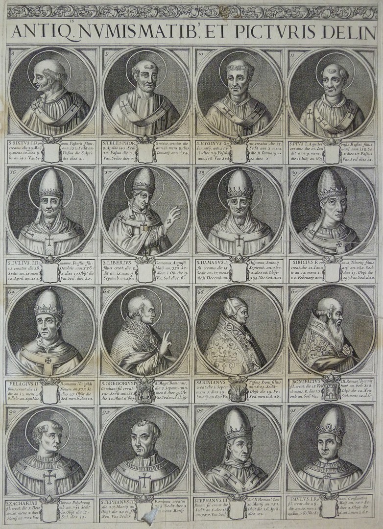 Zestien pausportretten met naam, data, herkomst en evt. familiewapens
