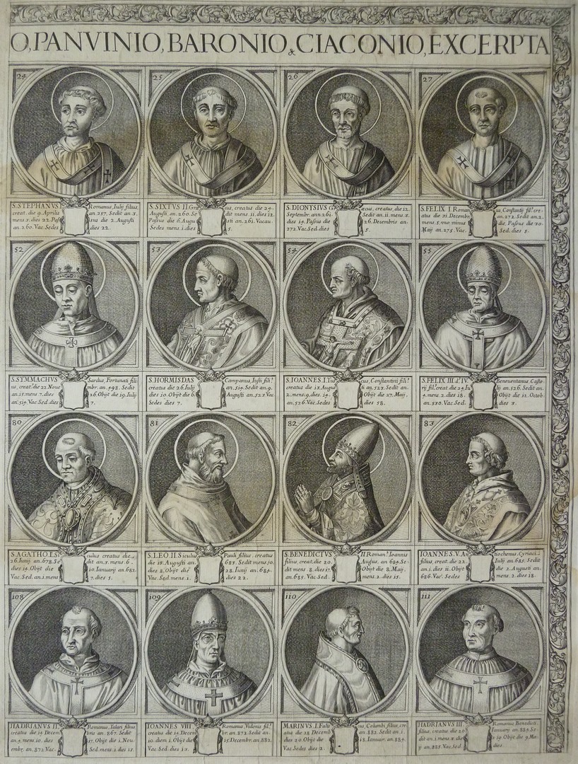 Zestien pausportretten met naam, data, herkomst en evt. familiewapens