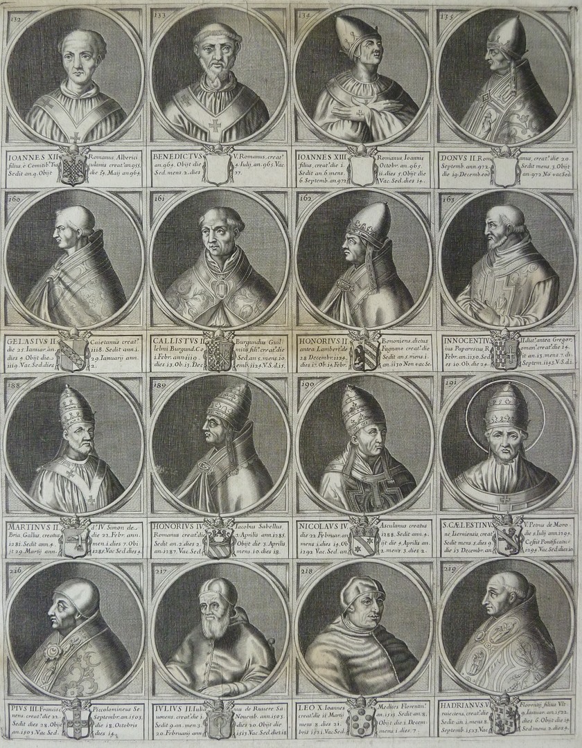 Zestien pausportretten met naam, data, herkomst en evt. familiewapens
