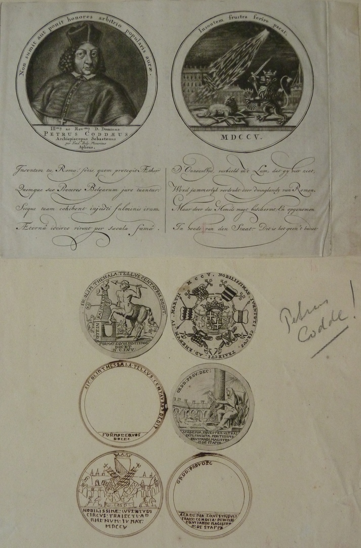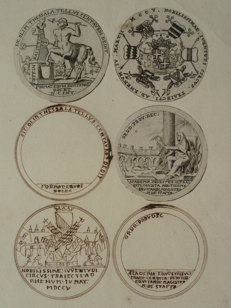 Zes medaillons, waarvan drie gravures en drie onderwerpen in bister