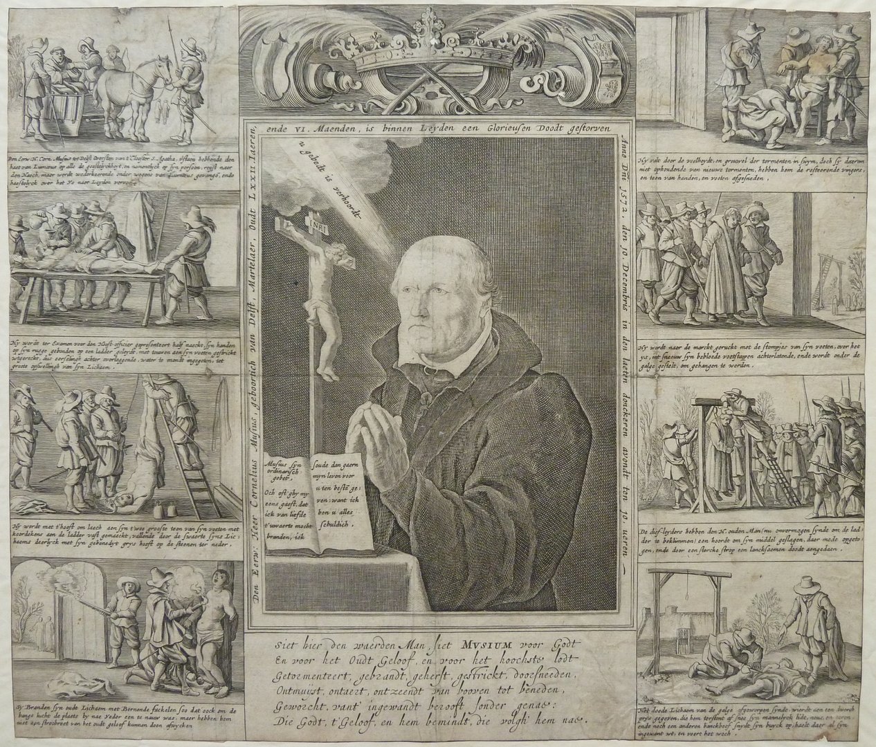 Portret van Cornelis Musius, omringd door acht afbeeldingen waarop zijn marteling is uitgebeeld