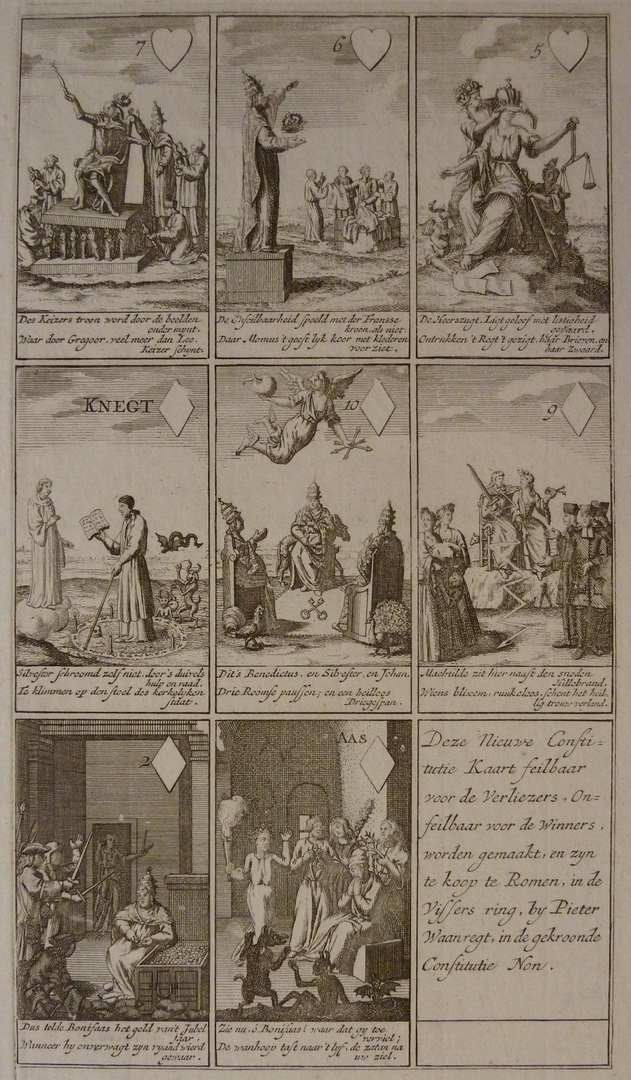 'Roomse onfeylbaarheyd word hier naar eys vertoond' serie (6) spotprenten als speelkaarten
