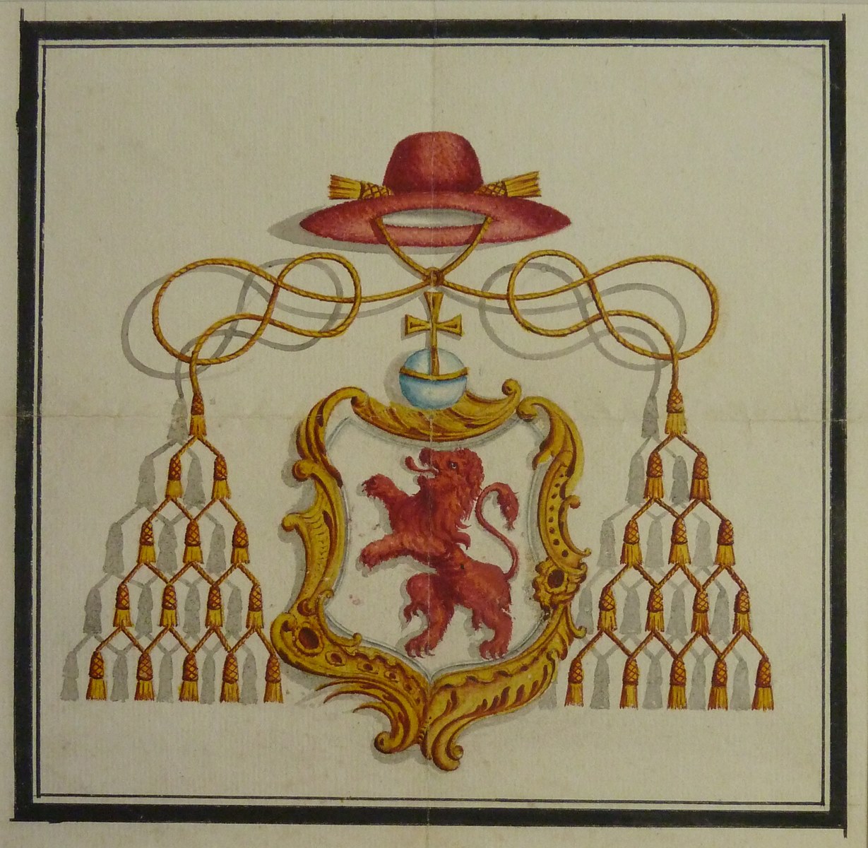 Wapen van kardinaal Miguel da Silva (1480-1566)(?) of van de Orde van de Heilige Hiëronymus(?) met staande leeuw, met wereldbol met kruis