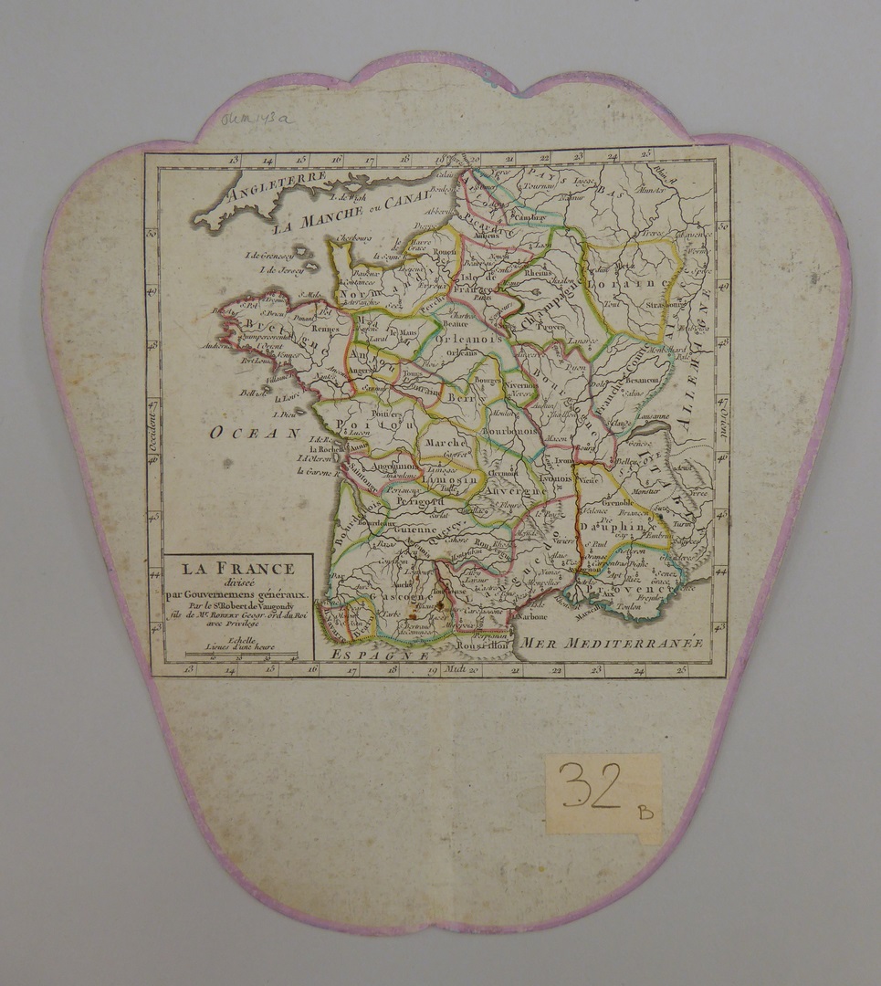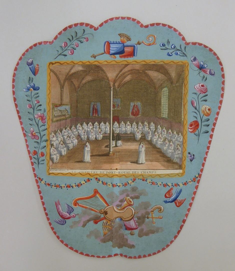 Waaier met prent uit Gezichten op het klooster van Port-Royal (serie) nr. 9: Het kapittel van Port-Royal des Champs, nonnen zitten langs muren, twee geknield in het midden, op achterzijde kaart van Frankrijk