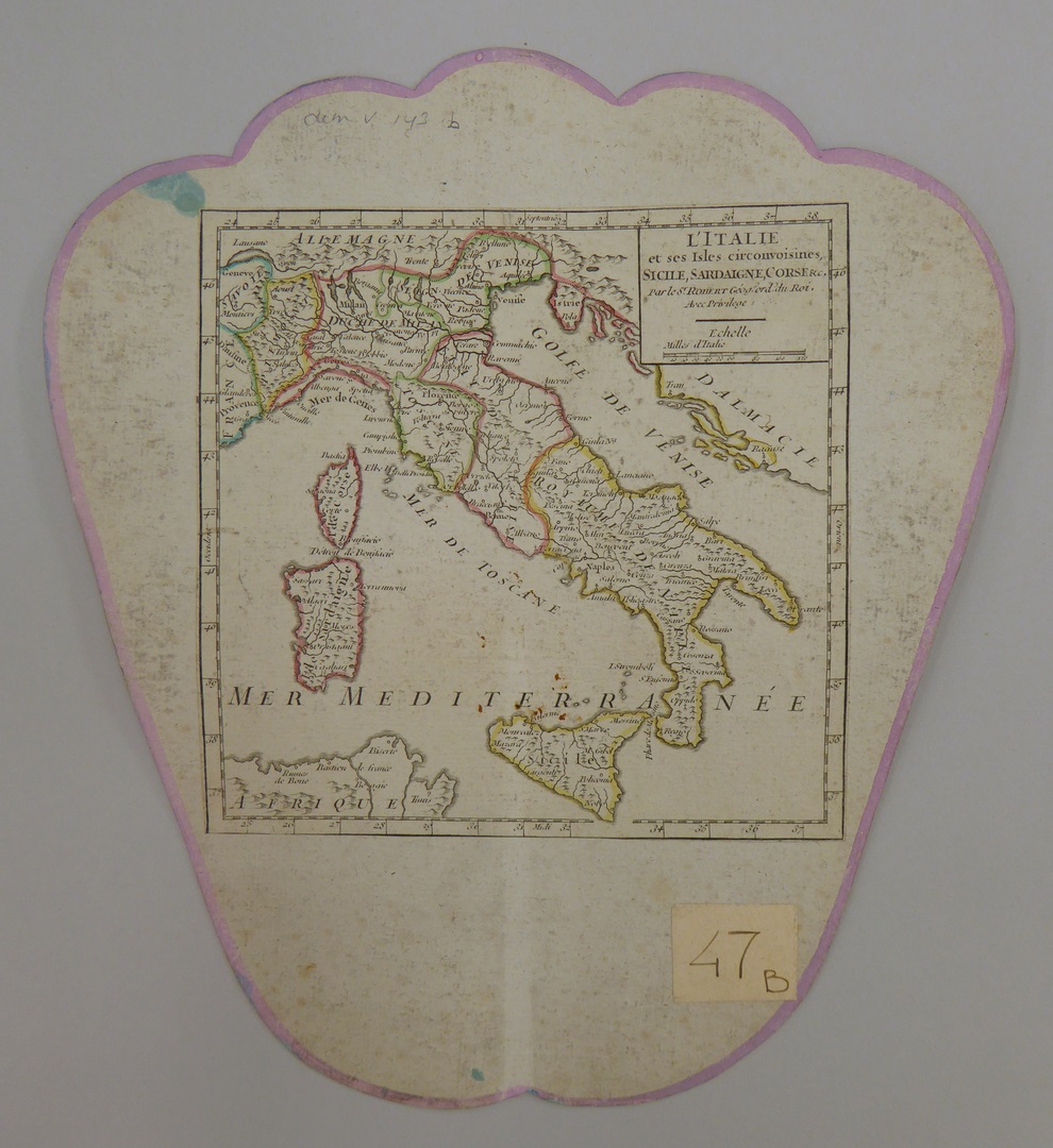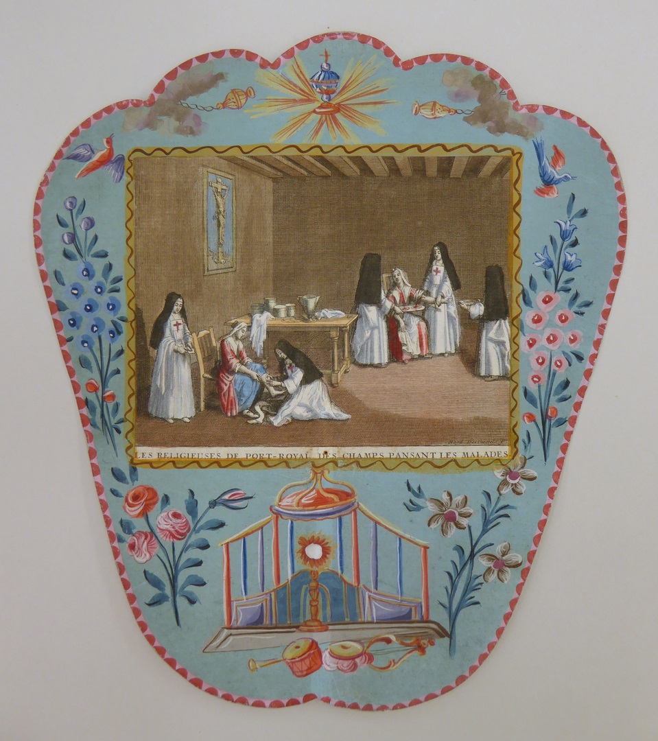 Waaier met prent uit Gezichten op het klooster van Port-Royal (serie) nr. 8: Nonnen van Port-Royal, zieken verzorgend, op achterzijde kaart van Italië
