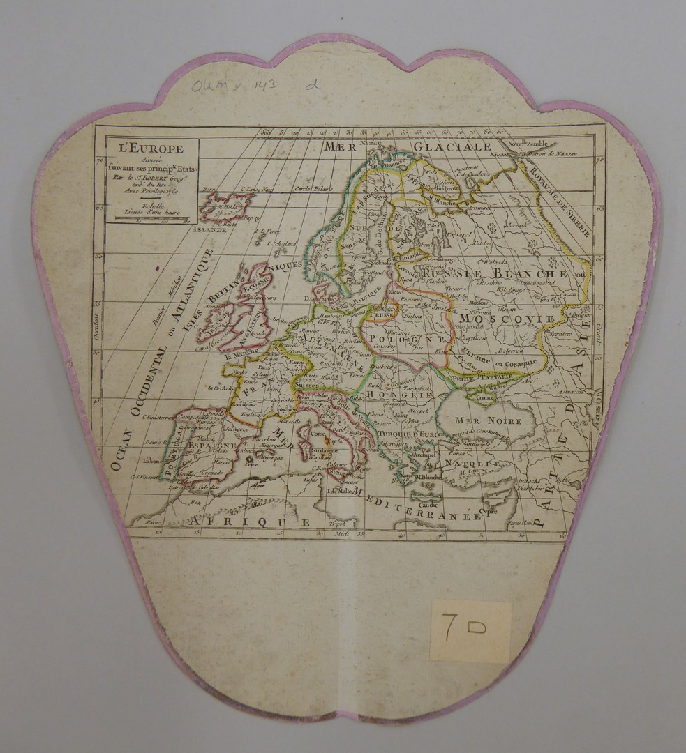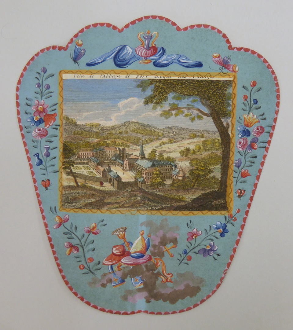 Waaier met prent uit Gezichten op het klooster van Port-Royal (serie) nr. 2: Gezicht op de abdij Port-Royal des Champs, op achterzijde kaart van Europa