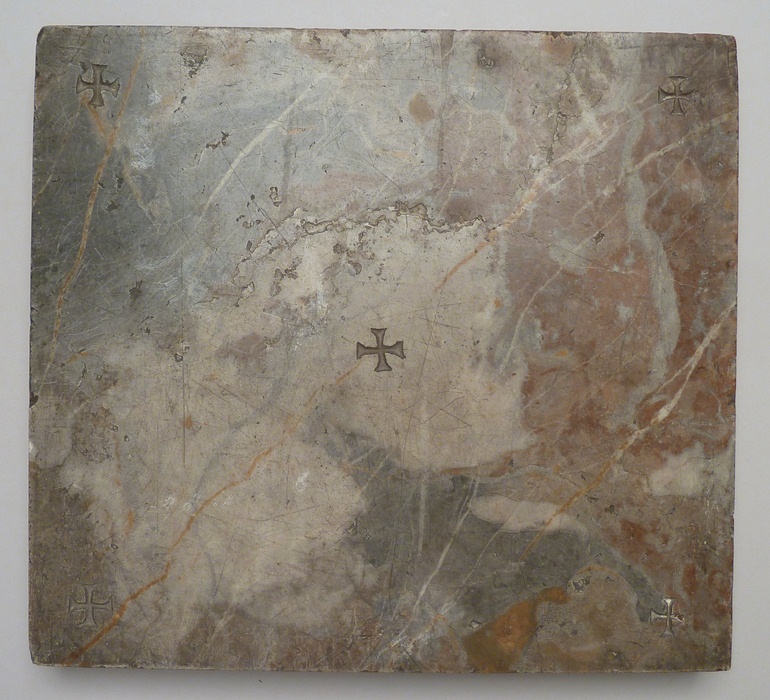 Altaarsteen met vijf kruisjes, van gekleurd geaderd marmer