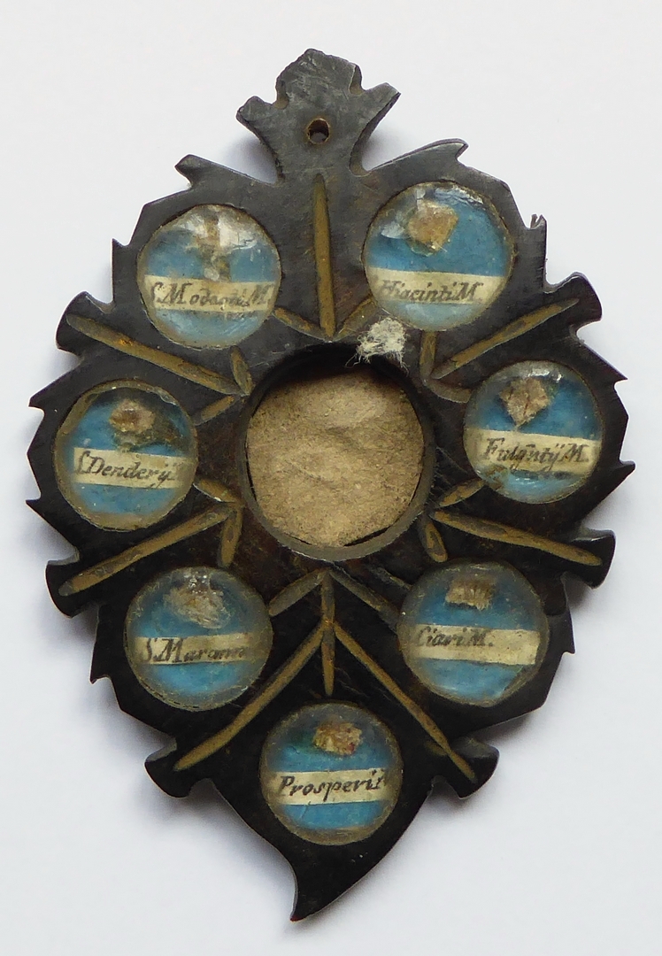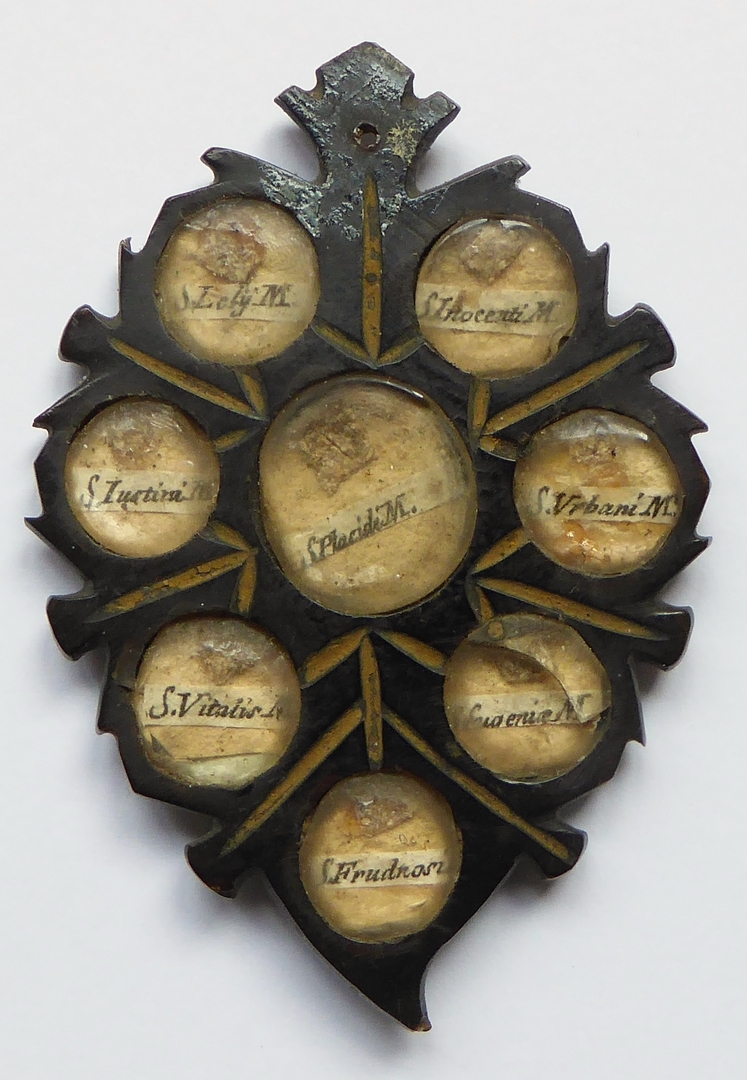 Reliekhoudertje, bladvorm met acht ronde openingen waarin reliekjes achter glas