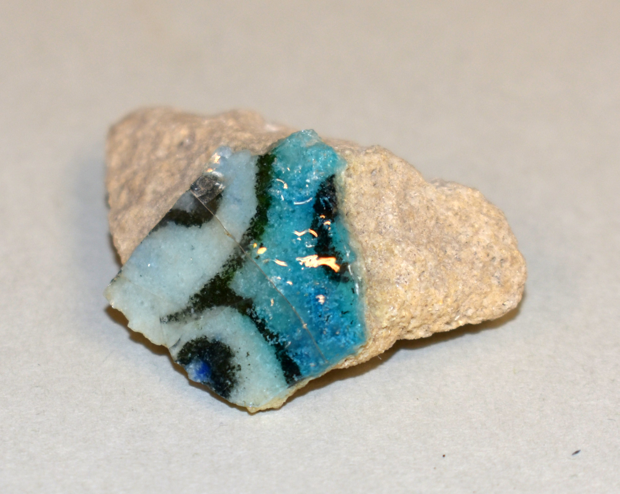 Archeologische vondst Rotskoepel: fragment van tegel met blauw en zwarte lijnen in glazuur